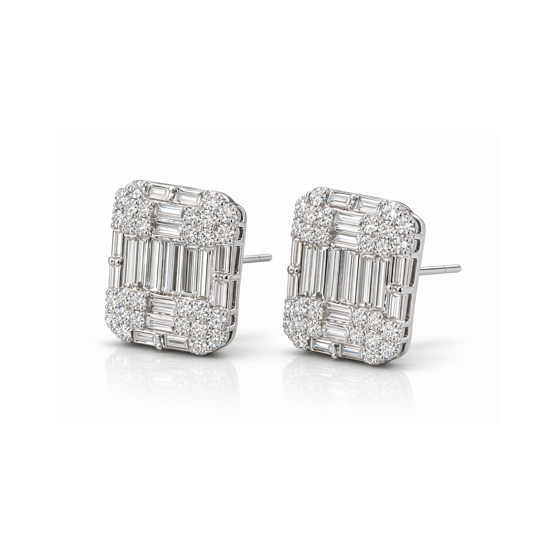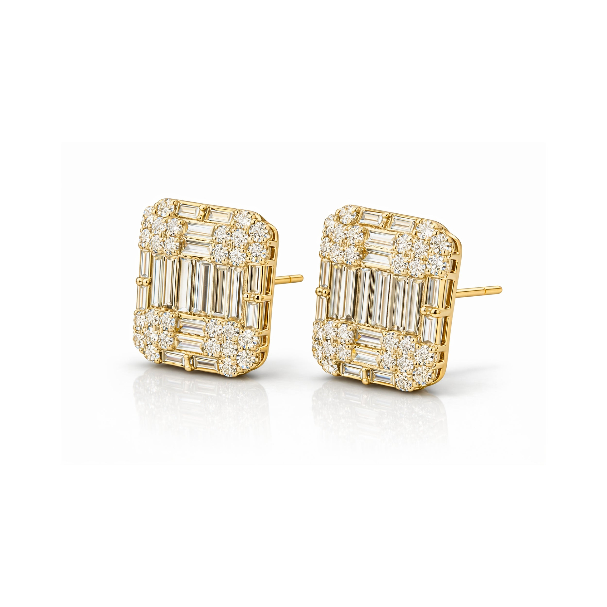 This is not a cluster earring. It is a composition, every baguette placed with the intention of a single, unified surface of light. The straight-edged precision of the baguettes creates the illusion's sharp geometry, while the round brilliants at the perimeter soften the silhouette and flood the piece with the continuous sparkle that only a brilliant cut produces. Two diamond cuts, one vision, a result that wears with the quiet authority of something far larger than its setting suggests.